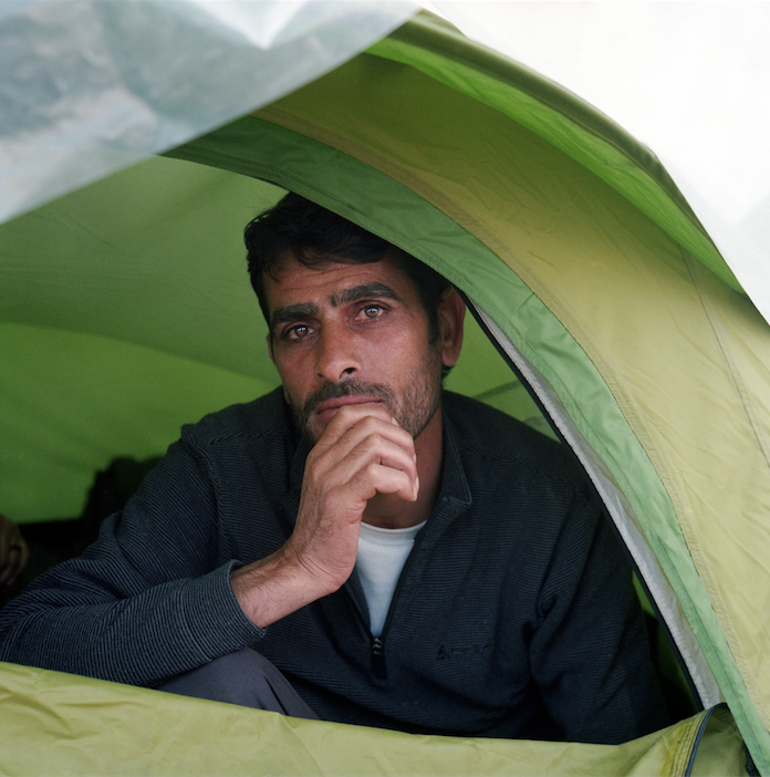 Syrian refugee inside his tent in Idomeni, Greece. March 2016. Photograph by Rena Effendi.